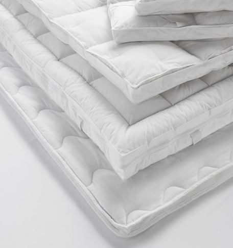 Double layer color white 80% down up layer, 100% duck feather on bottom, Hypo-Allergenic.